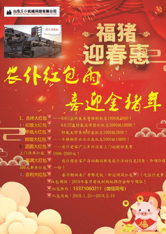為迎接2019金豬年的到來,讓更多的朋友用上農(nóng)仆涼皮機;山東農(nóng)仆機械科技有限公司現(xiàn)隆重推出七重購機大紅包,手慢無——